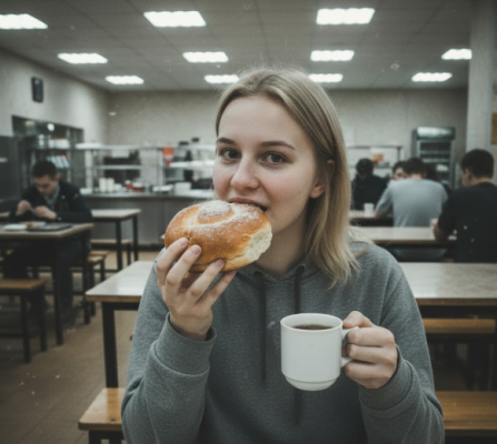 Блин, голова после философии просто квадратная. 😫 Препод задал читать про Канта, а у меня в голове только одно: **ЕДА**. Зашла в нашу столовку, смотрю на цены и думаю: а на что жить-то? До стипендии еще целая неделя, а на карте осталось ровно 185 рублей. Думала, просто чай попью и всё. Потому что комплексный обед стоит 250... Но потом увидела