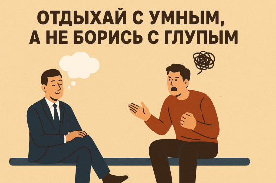Ум — это не болтовня и не показная эрудиция. Умный слышит тишину, чувствует границы, предугадывает ответ и удерживается, если нужно. С ним легко — он дает свободу. Глупый же спорит без конца, выматывает и лишает сил. Поэтому отдыхай рядом с умным. (По мотивам М. Жванецкого)